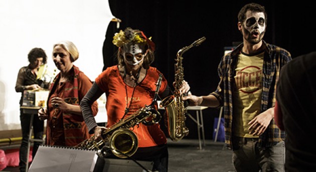 Les acteurs de la Compagnie 26000 couverts présentent le résultat des quelques jours du chantier qu’ils viennent d’effectuer, en vue de monter un nouveau spectacle de rue. L’idée du metteur en scène tourne autour d’une procession funèbre et musicale, entre légendes urbaines et faits divers inspirés du Mexique, où l’on conjure et nargue la mort dans la joie et le débordement. Chanteurs aux fenêtres, projections lumineuses sur les immeubles, marionnette géante, installation de feux, conversation amplifiée dans un camion-pizza, bref, du théâtre de rue…