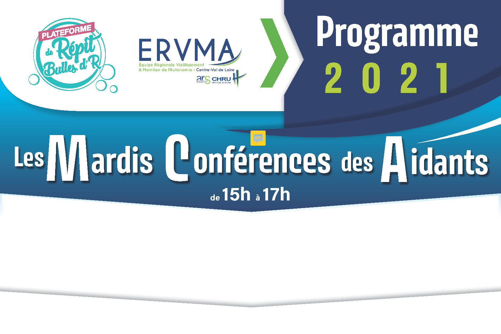 La Plateforme de Répit Bulles d’R avec le soutien de ERVMA et de l'équipe Régionale Vieillissement et Maintien de l’Autonomie proposent « Les Mardis Conférences des Aidants ».