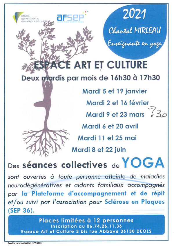 L'Association Française des Scléroses en Plaques propose des séances collectives de yoga ouvertes à toute personne atteinte de maladies neurodégénératives et aidants familiaux accompagnés par La Plateforme d’Accompagnement et de Répit et / ou suivi par l’association pour Sclérose en Plaques (SEP 36).